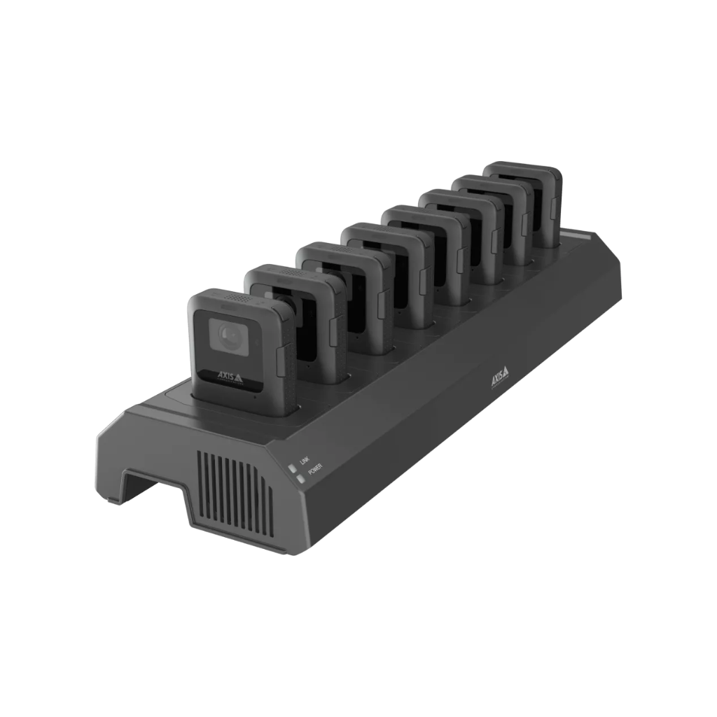 Carregue e sincronize até 8 dispositivos corporais com eficiência e segurança usando a estação de acoplamento AXIS W703 de 8 baias.