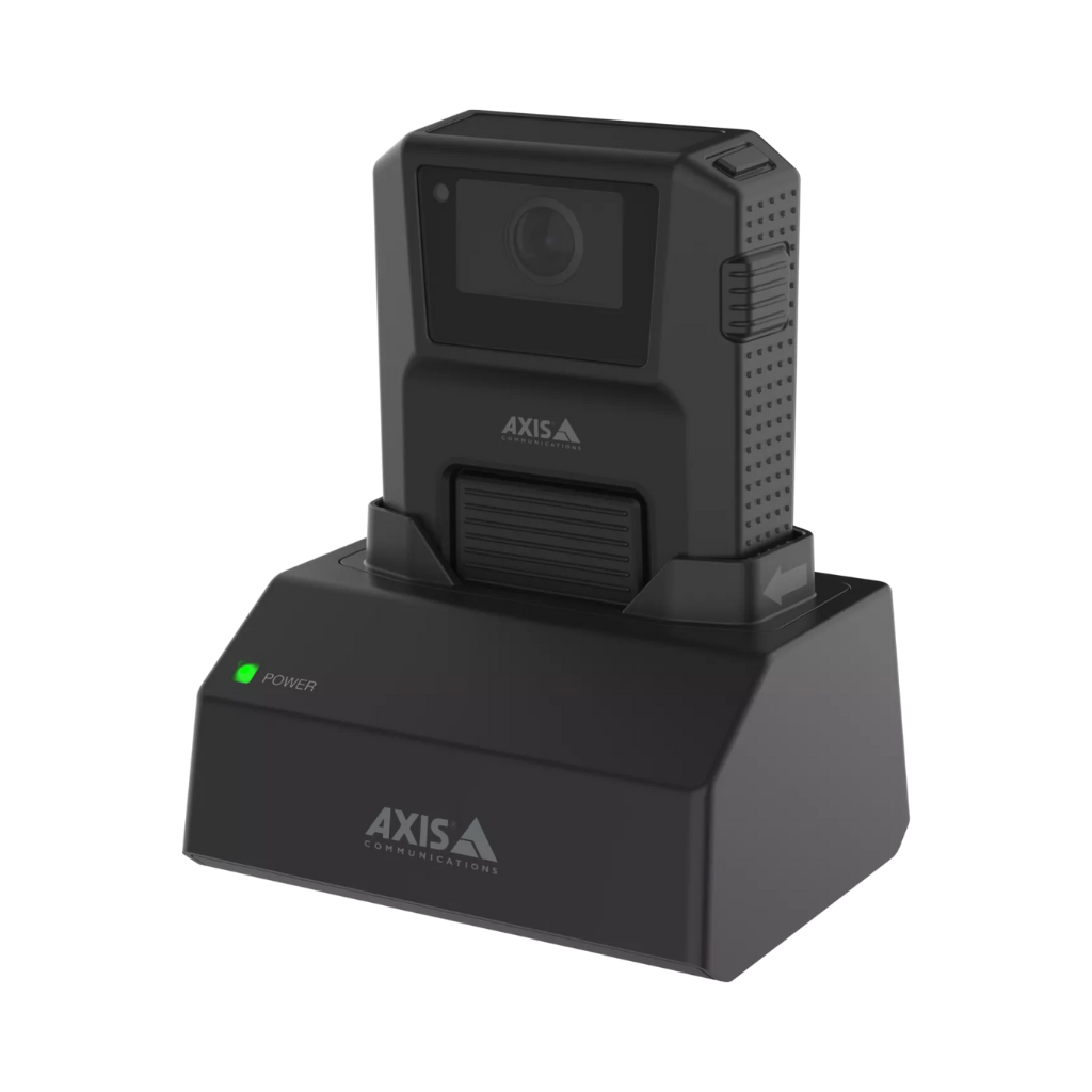 A Estação de acoplamento AXIS W700 Mk II 1 baia oferece armazenamento seguro e eficiente para vídeos de câmeras de segurança, sendo ideal para sistemas de vigilância menores e compactos.